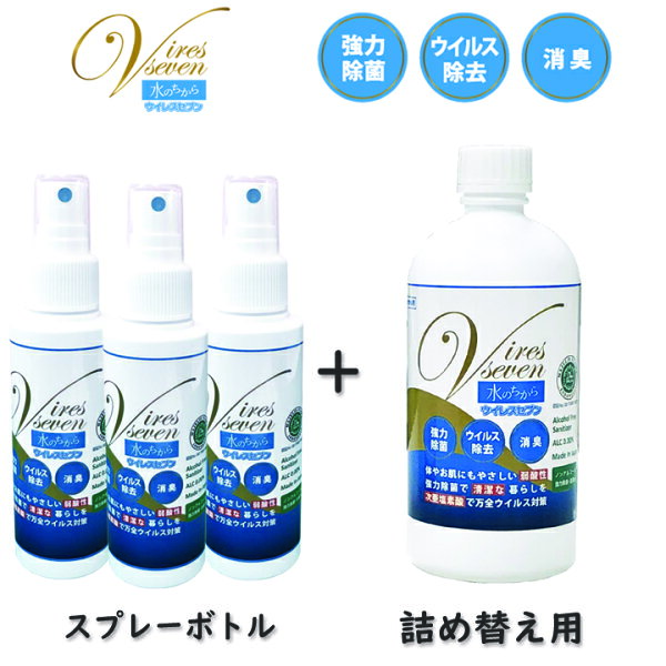 商品名 消臭・除菌・抗菌 100ml 除菌スプレー + 500ml 詰め替え用 ボトル 成分 次亜塩素酸 用途 人体・空間・衣類などの消臭・除菌・抗菌、マスクの消臭除菌 除菌力 99.99% 容量×個数 スプレー100ml×3本 + 詰替え用ボトル500ml×1本 強力除菌やウイルス対策、そして消臭除菌までのこの1本 「弱酸性で安全・無害な次亜塩素酸水」ウイルスセブン 【ウイルスセブン活用事例】 ・ウイルス対策として(ドアノブ・手洗い後・食卓・噴霧器による空間除菌など) ・黒カビ・クロカワカビ対策として(浴槽や、エアコン、サッシなどの湿度の高い所に ・空間除菌と消臭(落下菌・浮遊菌対策) ・花粉症等々の浮遊するウイルスや菌の対策 ・靴箱・靴内の消臭に ・トイレ内の消臭便座の除菌に ・手洗い後の除菌として ・お風呂場のカビ対策、ヌメりとり、排水溝の消臭対策に ・洗濯機内のカビ除去及び消臭に ・洗濯後の部屋干し衣類の消臭に ・生花の長持ち効果(カビ付着から水分が補強できないため) ・まな板・包丁の使用直後の除菌に(食材にも安心) ・水道蛇口のカビ対策に ・冷蔵庫内の消臭カビ菌対策に ・タバコ臭対策に ・生ごみ臭対策に ・加齢臭対策に ・ご家庭周りの除水溝・溝の消臭 ・室内での、焼き魚後や手洗いで落ちない魚臭の消臭 ・ペットの消臭に ・エアコンフィルターへのカビ対策、消臭効果 ・車内のエアコン・タバコ臭への消臭効果 ・釣り具や、クーラーボックスへの消臭効果 ・幼児やお年寄りの、おむつ交換の際の消臭効果 ・室内簡易トイレなどへの消臭水として利用 ・足への直接噴霧消臭効果 【ご使用上の注意】 ・幼児の手の届かないところに保管してください。